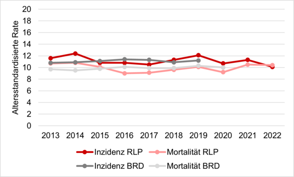 An Bauchspeicheldrüsenkrebs erkrankten 2022 in Rheinland-Pfalz 93 Frauen und 131 Männer. Im gleichen Jahr verstarben 96 Frauen und 119 Männer an dieser Erkrankung. In Deutschland wird Bauchspeicheldrüsenkrebs jährlich bei über 20.000 Menschen diagnostiziert.1 Die Inzidenz- und Mortalitätsraten für Rheinland-Pfalz (RLP) und Deutschland insgesamt (BRD) verdeutlichen durch das nahe Beieinanderliegen von Neuerkrankungen und Sterbefällen, sowohl bei Frauen (Abbildung 1) als auch bei Männern (Abbildung 2) die ungünstige Prognose für diese Erkrankung. Zudem zeigt sich in beiden Abbildungen, dass sich die Raten im Zeitraum 2013 bis 2022 sowohl in Rheinland-Pfalz als auch in Deutschland insgesamt kaum verändert haben.