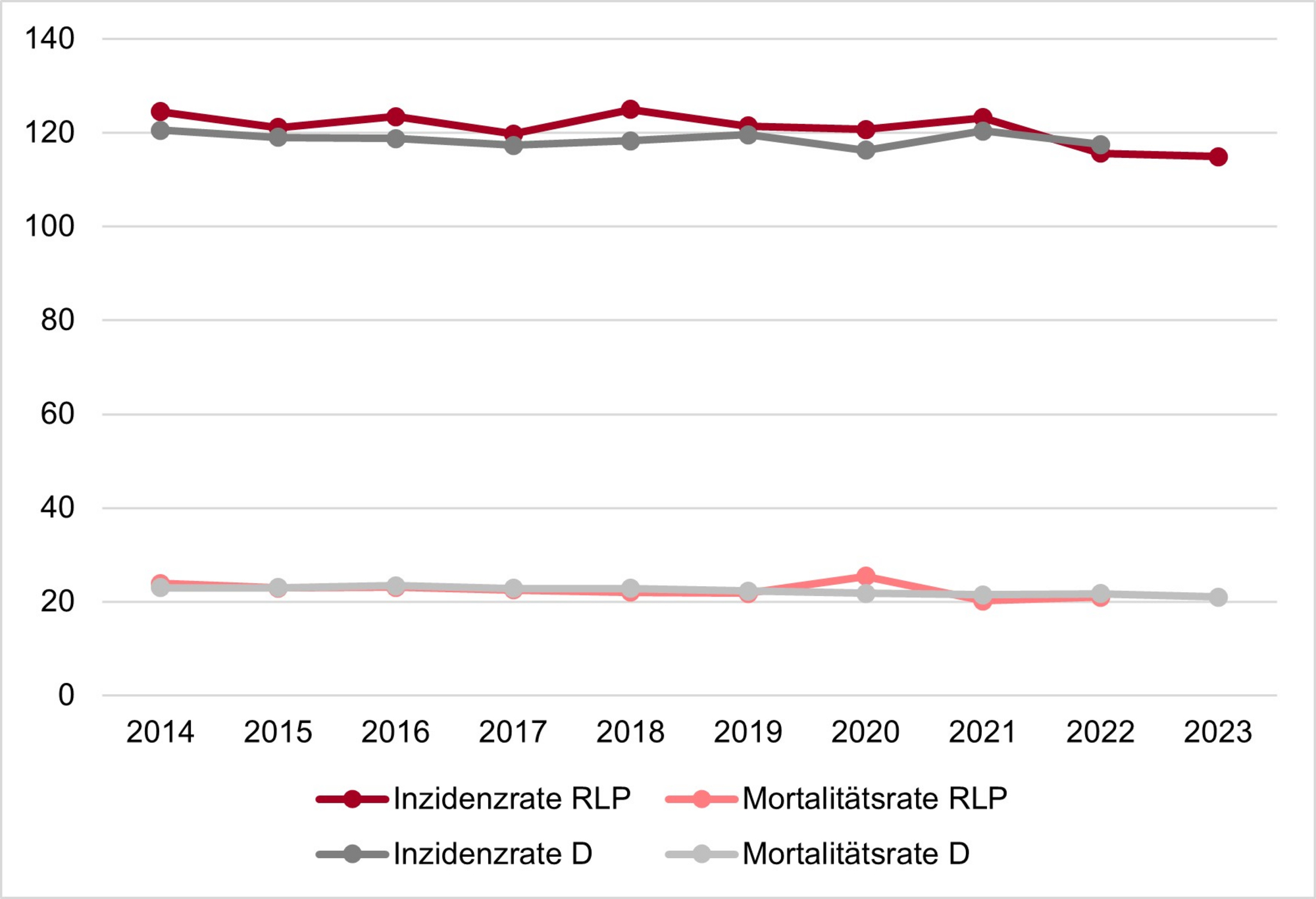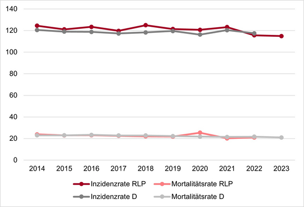 Im Jahr 2023 wurde in Rheinland-Pfalz bei 3.650 Frauen und 53 Männern Brustkrebs diagnostiziert. Im gleichen Jahr verstarben 964 Frauen und 13 Männer an dieser Erkrankung. Die Inzidenz- und Mortalitätsraten für Rheinland-Pfalz und Deutschland insgesamt zeigen für Frauen rückläufige Zahlen (Abbildung 1).