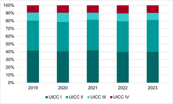 Im Vergleich zu den Inzidenzraten sind die Mortalitätsraten bei Frauen mit Brustkrebs sehr gering (Abbildung 1). Die sehr gute Prognose für die meisten Brustkrebspatientinnen hängt damit zusammen, dass die Tumoren oft in frühen Stadien diagnostiziert werden. Denn die frühen Stadien UICC I und UICC II machen rund 80 % der neu diagnostizierten Fälle aus (Abbildung 2). Die fortgeschrittenen Stadien UICC III und UICC IV dagegen betreffen nur etwa 20 % der neu diagnostizierten Brusttumoren.