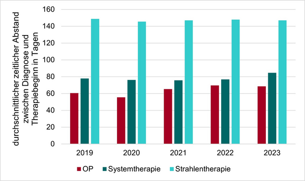 Die Auswertungen zu den UICC-Stadien (Abbildung 2) zeigen, dass es während und nach der Pandemie zu keinen bemerkenswerten Verschiebungen der Stadien kam. So konnten Befürchtungen entkräftet werden, dass es durch die Pandemie zu verspäteten Diagnosen und damit einer größeren Zahl an fortgeschrittenen Erkrankungen kam. Auch die Befürchtung, dass es zu möglichen Verzögerungen in der Behandlung kam, können die Krebsregisterdaten entkräften. Die durchschnittliche Dauer zwischen Diagnose und Beginn der Therapie ist über die Zeit etwa gleichgeblieben (Abbildung 3).