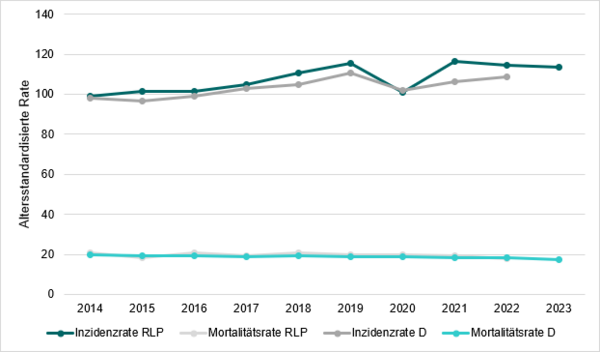Im Jahr 2023 wurde in Rheinland-Pfalz bei 4.077 Männern Prostatakrebs diagnostiziert. Im gleichen Jahr verstarben 792 Männer an dieser Erkrankung. Die Inzidenzraten für Rheinland-Pfalz (RLP) und Deutschland insgesamt (D) zeigen in den letzten Jahren einen Anstieg (Abbildung 1). Die Mortalitätsraten sind tendenziell rückläufig sind (Abbildung 1). Prostatakerbs ist die häufigste Krebserkrankung bei Männern, sowohl in Rheinland-Pfalz als auch deutschlandweit. Die steigenden Neuerkrankungen könnten ein Hinweis darauf sein, dass mehr Männer die Möglichkeit der Früherkennung mittels PSA-Test wahrnehmen (1). Prostatakarzinome haben in der Regel eine gute Prognose, was sich auch in den niedrigen und leicht rückläufigen Mortalitätsraten wiederspigelt. Viele Tumoren sind lokal begrenzt benötigen zunächst keine unmittelbare Therapie. Die Patienten werden allerdings zu regelmäßigen Kontrolluntersuchungen einbestellt („Aktive Überwachung“).