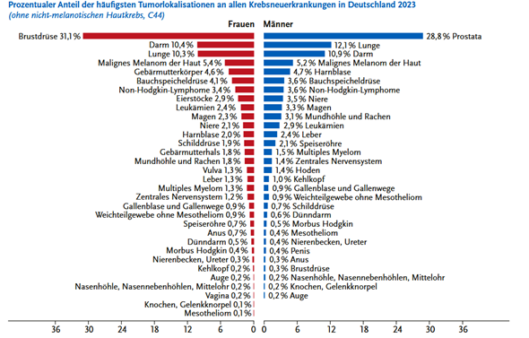 - Fast jede zweite Krebserkrankung betrifft Prostata, Brust, Lunge oder Darm.