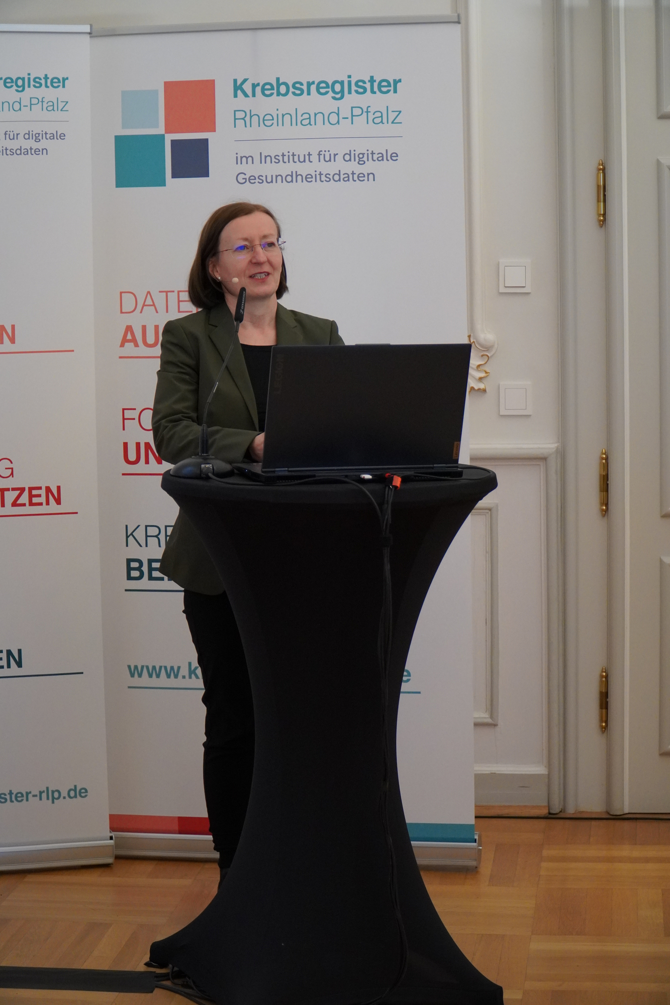 Nach der ersten lebhaften Podiumsdiskussion folgte nach einer kurzen Pause der Vortrag von Dr. Katja Schwarzer, Ärztliche Leiterin des IDG. Sie stellte das IDG insbesondere als Partner für Ärztinnen und Ärzte und medizinische Einrichtungen vor. Unter den vielfältigen Serviceangeboten finden sich beispielsweise ein Medizinischer Dokumentationsservice (MEDoServ), der die medizinischen Einrichtungen die Krebsregistermeldungen abnimmt oder bei der Vorbereitung von Tumorkonferenzen sowie bei Zertifizierungsaudits unterstützt. Außerdem bietet das IDG den Aufbau und Betrieb von medizinischen Registern an.