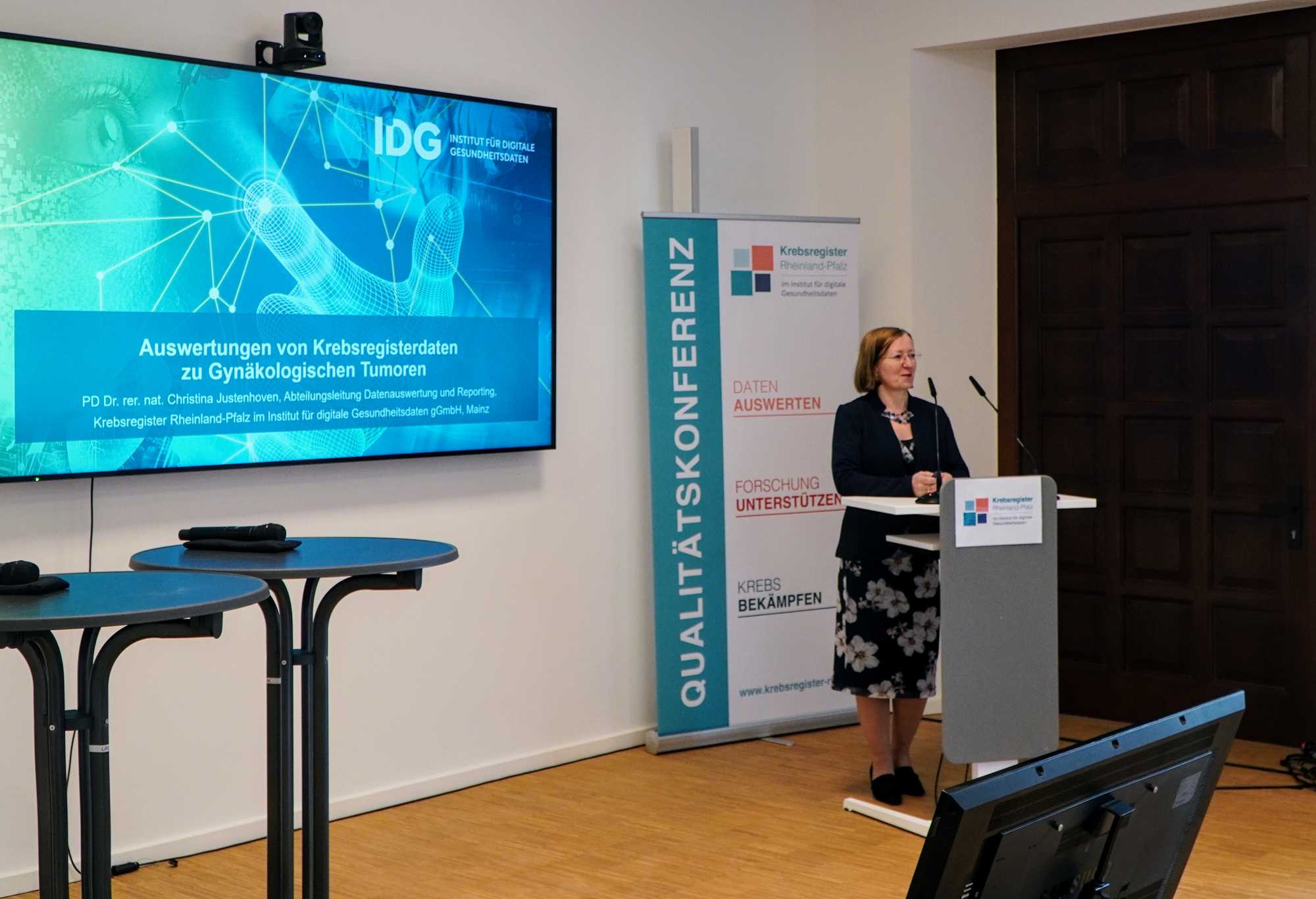 Nach der Pause präsentierte PD Dr. rer. nat. Christina Justenhoven (Leitung Datenauswertung und Reporting des Krebsregisters im IDG) die neuesten Auswertungen zu gynäkologischen Tumoren auf Basis von qualitätsgesicherten Daten aus dem Krebsregister RLP. Ihre Analysen zeigten Trends in Inzidenzen, Therapieverläufen und Überlebensraten – und unterstrichen den Wert kontinuierlicher Qualitätsmessung für eine evidenzbasierte Versorgung.