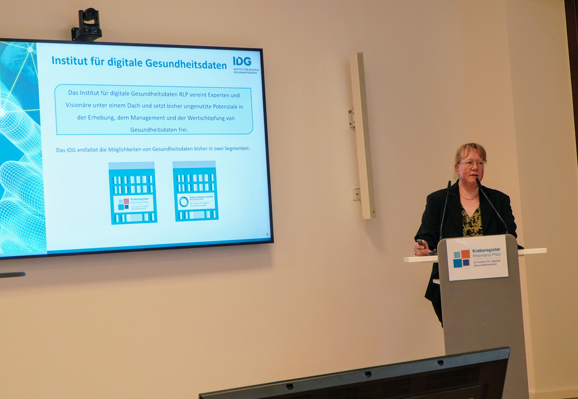Nach der Begrüßung durch Dr. Katja Schwarzer (Ärztliche Leiterin IDG) und Grußworten von Staatssekretärin Nicole Steingaß (Ministerium für Wissenschaft und Gesundheit RLP) und Prof. Dr. med. Ralf Kiesslich (Vorstandsvorsitzender und Medizinischer Vorstand Universitätsmedizin Mainz) gab Dr. Katja Schwarzer einen Überblick über die aktuellen Entwicklungen im IDG.